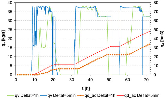 Simulation results for the freshwater mass flow rate () and freshwater volume () for three days in summer, 21–23 June, with 5 min and 1 h time steps.