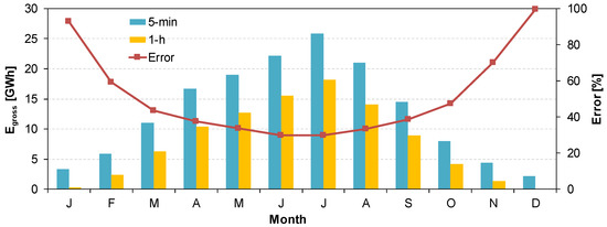 Yearly production of gross electric energy obtained with 5 min and 1 h simulation time steps.