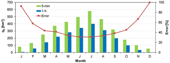 Table 2 presents the gross electric energy () and freshwater production () obtained when simulating one year using two different time steps, 5 min and 1 h. The relative errors in the electric power (εE) and freshwater production (εqd) estimations with the 1 h simulation are also shown, wherein the exact value was considered that of the 5 min simulation. Figure 9 and Figure 10 show the evolution of the gross electric energy and freshwater production on a full-year basis, month by month.