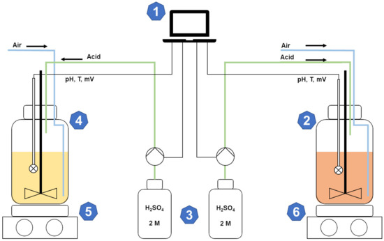 Continuous stirred tank reactor (CSTR) configuration. The CSTR consisted of a process control transmitter (1) controlling the pH value of two independent bioleaching cultures of A. ferridurans (2) and A. thiooxidans (4) using connected pH sensors and acid pumps (3). Temperature control and reactor stirring were done by two hot plate stirrers (5 and 6).
