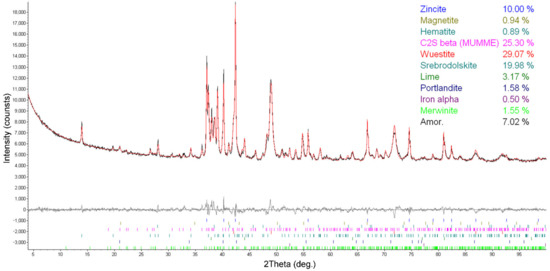 Results of XRD analysis of BOF slag. The main minerals are listed according to their concentration (wt.%). Zincite was used as an internal standard.