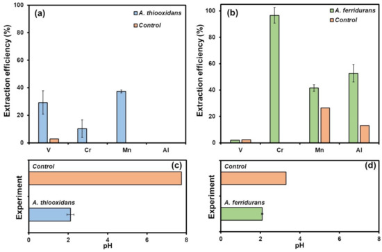 Bioleaching efficiency and pH values in batch modes. The metal extraction efficiency and pH values of A. thiooxidans (a,c) and A. ferridurans (b,d) and abiotic controls after two weeks. Error bars indicate the standard deviation (n = 2).