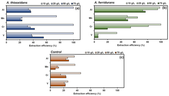 With increasing slag concentrations, the metal extraction efficiency decreased, and the acid consumption increased for both bacteria, which is in agreement with previous studies [13,18,25]. Nevertheless, the Al and Mn bioleaching efficiencies remained consistently above 80 and 50% with A. ferridurans, decreasing to <40% with A. thiooxidans and <20% in the abiotic control. At the highest slag concentration tested (75 g/L), bioleaching with A. thiooxidans was more effective in extracting metals such as Cr and V, whereas bioleaching with A. ferridurans resulted in higher efficiency for Al and Mn, comparable to previous studies [40,41].