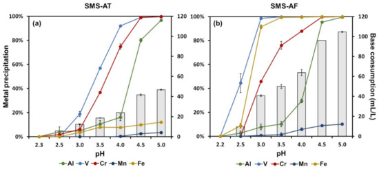 The selective chemical precipitation of Al, V, Cr, Mn, and Fe from the synthetic metal solutions (SMS-AT and SMS-AF) was tested by adjusting the pH from 2.5 to 5. Figure 5a shows the metals precipitation and the base consumption at each pH value of the SMS-AT. At pH 2.5, Al (4%) and Cr (2%) started to precipitate, and at pH 3, so did V (19%). At pH 4, 92% V and 75% Cr were precipitated from the solution, with 16% Al and 8% Fe. Thus, 24 mL/L 1 M NaOH was consumed. At pH 5, the entire V and Cr and 97% Al were recovered, whereas Mn (3%) and Fe (12%) remained nearly stable in the solution. These results prove that V and Cr could be selectively recovered from A. thiooxidans biolixiviant at pH 4, and Al at pH 5, whereas Mn and Fe remained in the solution. A previous study reported that >99% of Mn was removed at pH 11 [32]. However, it should be considered that adjusting to pH 11 is accompanied by a much higher base consumption.