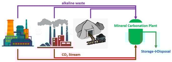 Some of the industrial wastes applicable for MC include coal fly ash, metallurgical slag, concrete wastes, mining and mineral processing wastes, and paper mill wastes [3,9,10,11,12,13,14,15,16,17,18,19]. As indicated above, although the quantity of available alkaline wastes is small compared to natural silicate minerals, they could fix a relevant amount of CO2 in some industries, particularly where CO2 and alkaline wastes are produced nearby. This could contribute to the possible de-carbonization of specific industrial sectors, such as the cement and metallurgical industries (Figure 1).