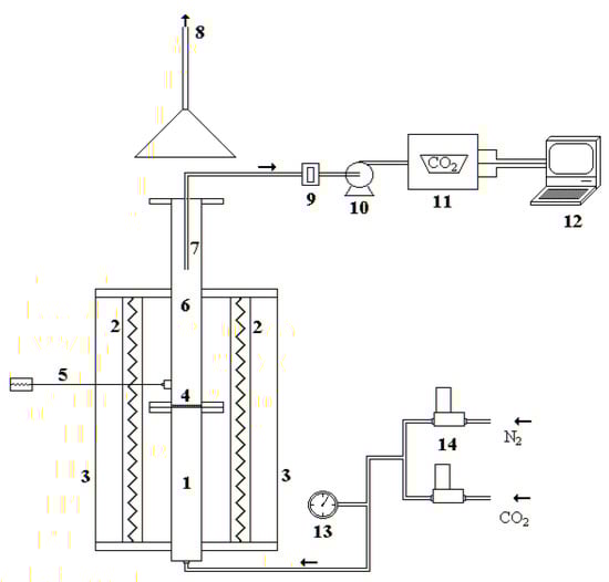 Experimental fluidized bed apparatus: (1) gas preheating section; (2) electrical furnaces; (3) ceramic insulator; (4) gas distributor; (5) thermocouple; (6) fluidization column; (7) exhaust gas suction probe; (8) stack; (9) cellulose filter; (10) membrane pump; (11) gas analyzer; (12) personal computer; (13) manometer; (14) digital mass flowmeters.
