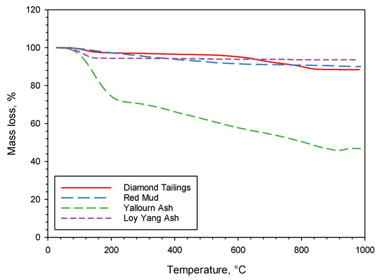 The following four different waste materials from the Australian mining and industrial sectors were tested to quantify their CO2 capture capacity: diamond tailings (DT), red mud (RM), Yallourn coal ash (YA), and Loy Yang coal ash (LYA). XRF analysis of the four as-received materials (on dry basis) is reported in Table 1. All materials present a large amount of inert compounds towards CO2, such as SiO2, aluminum-based, and iron-based compounds.