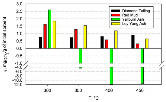 Contrary to the above results, the RM samples show a larger capture capacity and a decreasing trend with temperature. In this case, the maximum capture capacity value was found at 300 °C, and it was equal to 1.62 mgCO2/g, while, as the temperature increased, a lower value was recorded, down to the minimum value of 0.32 mgCO2/g at 450 °C.