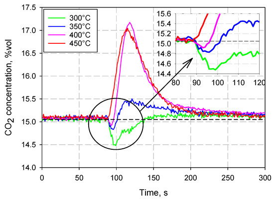 YA exhibited a singular behavior during the tests; CO2 capture was only recorded at 300 °C, while, starting from 350 °C, the sorbent began to release CO2, rather than absorb it. This can be clearly observed in Figure 5, which shows the CO2 concentration profiles measured during the tests at the different investigated temperatures (it must be remembered that the feed gas was composed of 15% CO2 and 85% N2 in volume).