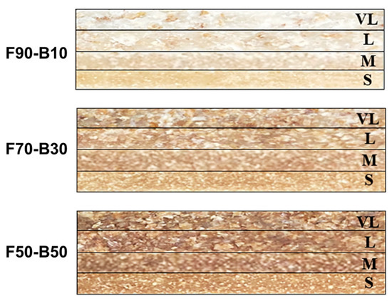 Appearance of fresh noodles prepared with flour-bran blends at different blending ratios and bran sizes. VL, L, M, and S indicate the brans with very large, large, medium, and small particle sizes.