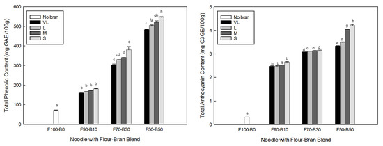 The total phenolic compound and total anthocyanin contents of fresh noodles prepared from the flour-bran blends with different blend ratios and bran sizes are shown in Figure 3. Fresh noodles prepared with flour alone exhibited a total phenolic content of 69.9 mg GAE/100 g and total anthocyanin content of 0.31 mg C3GE/100 g. The total phenolic content (TPC) of fresh noodles with the blend with VL bran was 158.7 for F90-B10, 302.8 for F70-B30, and 482.8 mg GAE/100 g for F50-B50, increasing significantly and proportionally as the blending ratio increased (p < 0.05). Within the same blending ratio of bran, the total phenolic content of the noodles with blends increased significantly (e.g., from 328.8 to 380.1 mg GAE/100 g for F70-B30, and from 504.2 to 546.3 mg GAE/100 g for F50-B50) as bran size decreased from L to S. The TPC increase is possibly due to an increase in surface area to mass by particle size reduction and the increased extraction of phytochemicals [56]. Black-purple wheat varieties have higher total phenolic content than white varieties [57]. Avarzed et al. [29] also reported that purple-colored wheat bran contains higher total phenolic content than normal wheat bran, which is a similar trend to our result.