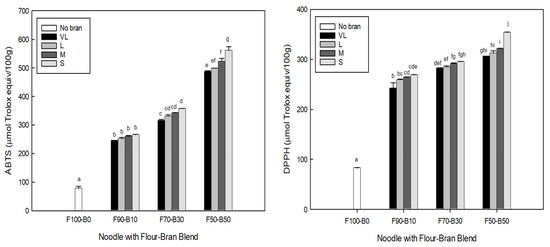 Antioxidant activity as indicated by ABTS and DPPH radical-scavenging activity of fresh noodles with flour-bran blends at different blending ratios and bran sizes. The different letters above the bars are significantly different (p < 0.05) according to Tukey’s HSD test. VL, L, M, and S indicate the brans with very large, large, medium, and small particle sizes.