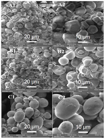 The microparticles formed with maltodextrin (Figure 2D1,D2) and gum arabic (Figure 2E1,E2) were smaller than with starches. The microparticles formed with maltodextrin had a rounded shape and a smooth surface, whereas those formed with gum arabic had an indefinite shape and the surface was wrinkled. According to Cai and Corke [], granules with smooth walls or without cracks have higher protection of the core to heat and oxidation. Therefore, the proteins most likely remained in the innermost part of the maltodextrin and gum arabic granules, maintaining the enzymatic activity.