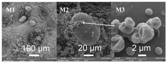 Scanning electron photomicrographs of the powders formed in the spray drying of the mixture of maltodextrin (2.5% w/v); gum arabic (2.5% w/v); soluble starch (5.0% w/v) with enzymatic extract (M1–M3). The white arrows indicate the point where the magnification was performed (20 kx).