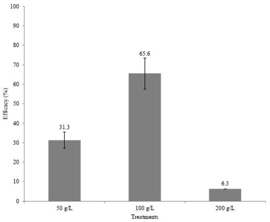 Figure 5 shows that the maximum control efficiency 24 h after the emergence of C. capitata pupae was 65.6% and it was obtained in the treatment with a powder concentration of 100 g/L. Similar results were found in other studies on the biocontrol of C. capitata. Lozano-Tovar et al. [], using the crude fermented extract of Metarhizium brunneum and Metarhizium roberstii, obtained control efficiencies (24 h after the emergence of the fly) of approximately 70 and 60%, respectively. Yousef et al. [] reported a control efficiency of 73% (25 h after the emergence of the fly) using the crude extract of M. brunneum. However, the runs of insecticidal activity were performed by ingestion and not by contact, as the current work did. The worst control efficiency (6.3%) was obtained with the treatment of the highest powder concentration (200 g/L). The solution prepared with this concentration showed a viscous aspect with high turbidity. This probably repelled the insects and prevented their contamination, resulting in poor control efficiency.