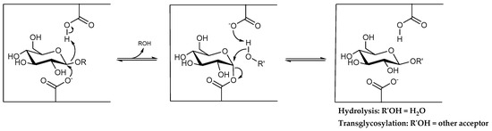 Transglycosylation is a kinetically controlled process involving the enzymatic transfer of a sugar residue from a substrate (di, oligo, polysaccharide, or sugar derivative) to a non-water acceptor with a free hydroxyl group (Figure 1).