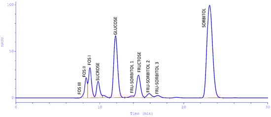 HPLC was performed using a chromatograph (Knauer GmbH, Berlin, Germany). The separation was carried out at 85 °C on an Aminex HPX87C column (Bio-Rad, Richmond, VA, USA) using a refractometric detector. The injection volume was 20 μL, the mobile phase (water) flow rate was 0.5 mL/min, and the data were collected using EuroChrome software. Standards of sorbitol, sucrose (also for fru-sorbitol determination), glucose, fructose, kestose, nystose, and fructosylnystose were used in the identification and quantification of the compounds.