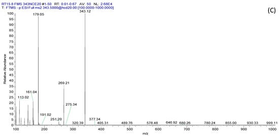 MS/MS spectra of fructosyl-sorbitol derivatives; (A): fru-sorbitol 1 in the chromatogram (Figure 2); (B): fru-sorbitol 2 (Figure 2); (C): fru-sorbiol 3 (Figure 2). Conditions of fru-sorbitol synthesis: sucrose/sorbitol ratio 1/1 (m/m), 37 ± 1 °C, pH 6.8–6.9, enzyme 11,760 U/100 g of sucrose, time 1 h.