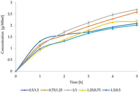 The available literature data indicate that the ratio of donor to acceptor is an important parameter for the efficiency of transglycosylation. Gonzalez-Muñoz et al. [16] reported that during the synthesis of fructosyl-glycerol using levansucrose, the transglycosylation activity of the enzyme increased when the initial glycerol content was increased to 25% and then decreased when the initial glycerol content was 50%. In the case of the synthesis of gal-polyols with β-galactosidase from Kluyveromyces lactis, it was also observed that increasing the polyol content in the starting solution caused an increase in the maximum gal-polyol content only up to a certain point, and the optimal lactose-to-polyol ratio was 1:1.85 [14]. In other experiments, during the synthesis of fructosyl-mannitol, the predicted decrease in the production of the derivative was observed when the amount of the sugar residue donor was reduced [17].