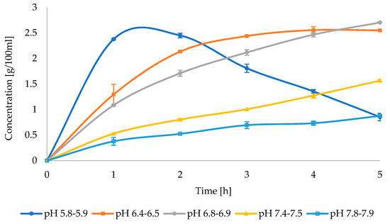 From the range of pH 5.8 to 7.9, the level of 6.8–6.9 was the most favorable in terms of product concentration (Figure 5); the highest total amount of fructosyl sorbitol derivatives was obtained under these conditions (2.7 g/100 mL; conversion rate 3.9%). During the reaction carried out at pH 5.8–5.9, a sharp increase in the amount of FSs obtained during the first hour (2.45 g/100 mL) was observed. This value was comparable to the amount obtained after 4 h at a pH of 6.8–6.9. In the second hour, there was a slight increase in the concentration of the product, but in the third hour, there was a rapid decrease in the concentration of FSs as a result of their degradation (after 5 h, less than 32% of the amount obtained at a pH of 6.8–6.9 remained)—a change in pH causes a modification of the enzyme active site; as a result, the product is more easily used as a substrate. Given the opportunity to significantly shorten the reaction time with little loss of efficiency, the use of a lower pH for fructofuranosidase is worth considering.