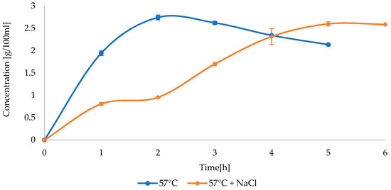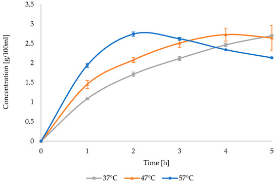The β-fructofuranosidases used in transglycosylation act over a wide temperature range (37–60 °C, and even approx. 90 °C [25]). Therefore, the influence of this parameter on the fru-sorbitol synthesis was determined. The reaction was carried out at 37, 47, and 57 °C (Figure 6). The temperature mainly influenced the kinetics of the reaction. Comparable values of FS concentrations were obtained after 2 h at 57 °C (2.74 g/100 mL), after 4 h for the reaction carried out at 47 °C (2.73 g/100 mL), and after 5 h at 37 °C (2.7 g/100 mL).