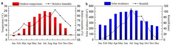 Climate data of Sanmenxia city: (a) annual temperature and humidity; (b) annual solar irradiance and rainfall.