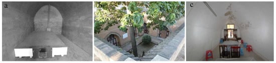 Photos of the selected underground cave dwelling: (a) Kang; (b) courtyard; (c) cave room.