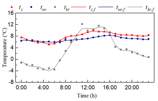 Figure 8 shows that the fitting curves expanded using Fourier series in six multi-harmonic solutions coincides with the discrete value very well. This indicates that the functions of the Fourier series expansion can accurately represent the fluctuations in the indoor and outdoor thermal effects.