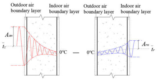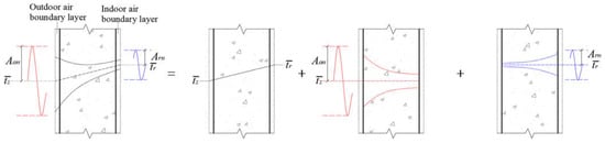 Based on the thermal inertia of the wall, the indoor and outdoor temperature waves are attenuated and delayed during the thermal transfer through the external wall. Therefore, the heat flux of the external wall can be considered as the difference between the following two conditions, as shown in Figure 9.