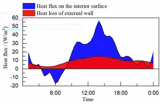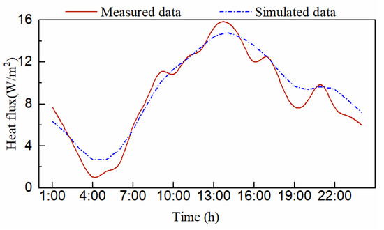 To analyze and verify the model, heat flux data of the external wall collected on 23 January were selected for comparison. The differences between the simulated and measured data during this period are presented in Figure 11.