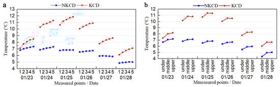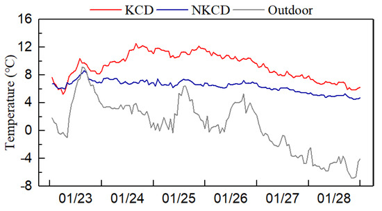 In this study, the temperature and relative humidity in the NKCD and KCD were quantitatively analyzed to verify the effectiveness of Kang heating, as shown in Figure 12 and Figure 13, respectively.