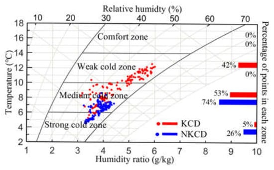 The heated indoor temperature was calculated to be 14 °C with a favorable relative humidity between 30% and 70%, according to the Design Standard for Energy Efficiency of Rural Residential Buildings. In a psychrometric chart, this relative humidity range was divided into four sections: comfort zone ( ≥ 14 °C), weak cold zone (14 °C > ≥ 10 °C), medium cold zone (10 °C > ≥ 6 °C), and strong cold zone (6 °C > ). As shown in Figure 13, the air-state measurement points in the NKCD and KCD did not reach the comfort zone. However, with the heat provided by the Kang, the thermal environment of the cave rooms improved and 42% of the entire monitoring period in the KCD maintained a temperature within the weak cold zone, whereas only 0.05% of the period saw temperatures in the strong cold zone. In contrast, in the NKCD, the air-state measurement points did not even reach the weak cold zone and 26% of the monitoring period remained in the strong cold zone.