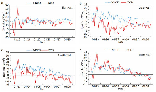 The NMBE value of 5.22% and the CV (RMSE) value of 17.35% were far below the requisite specified maximum of 25% [47]. Hence, the NMBE and CV (RMSE) parameters verified the validity of the model for calculating the heat flux of the wall, based on the mathematical model, and the thermal characteristics of the Kang can be further optimized. Based on the unsteady heat transfer model, the thermal performance of the external wall can be further analyzed.
