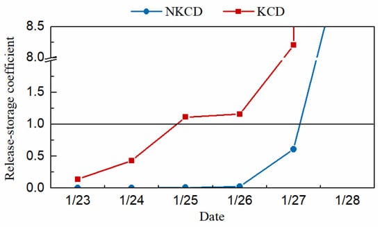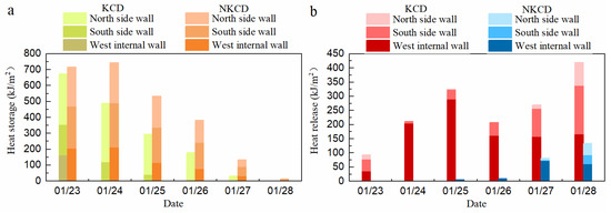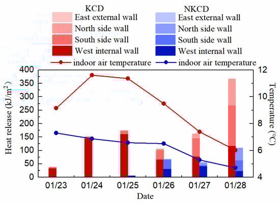Figure 12 shows that the outdoor temperature varied by 15.9 °C (from −6.8 °C to 9.1 °C) during the monitoring period, whereas the indoor temperature fluctuated by 4.1 °C (from 4.5 °C to 8.6 °C) in the NKCD and 7.3 °C (from 5.2 °C to 12.6 °C) in the KCD. Compared with the large fluctuation in the outdoor air temperature, the indoor air temperature in the cave rooms was relatively stable. In addition, the indoor temperature in the KCD was higher than that in the NKCD during the monitoring period, in which the temperature differences were large in the middle period (24–26 January) and then decreased in the later period (27–28 January). Due to the Kang heating, the indoor air temperature of the cave dwelling was increased by an average of 3.1 °C.