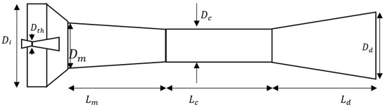 A schematic form of a typical TVC is shown in Figure 1. The constant area length (Lc), diverging diameter (Dd), and diverging length (Ld) have almost no impact on the interactions of the subsonic and supersonic inlet streams; therefore, they were not considered for optimization in TVC design [9].