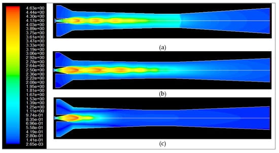 Figure 5b shows the mass average turbulence intensity over the whole TVC vs. the primary nozzle diameter of TVC. It reveals that by increasing the primary nozzle diameter (capacity), mass-average turbulence intensity increases, i.e., efficient mixing of supersonic and subsonic streams. Inversely, with the decrease of Dth, a longer mixing zone is required to accommodate a proper mixture of the inlet flows to keep ER close to 0.95.