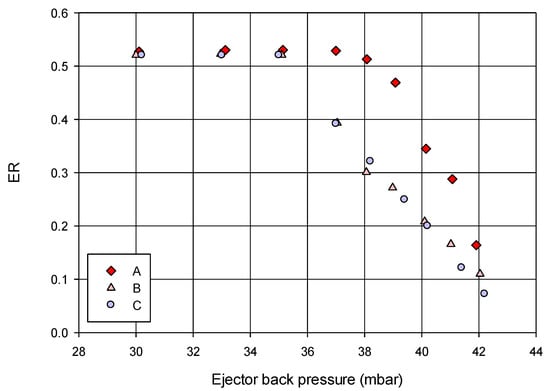 In order to increase the capacity, one approach can be to increase the primary nozzle diameter (Dth). This leads to a number of results involving (i) increasing the mass flow of motive steam that reduces ER, and (ii) shifting the shock position from constant diameter to the diverging zone. Maintaining the ER at its maximum value (ERmax = 0.95) and for different capacities, different levels of dimensionless (), () and () were considered, and a comparative study was conducted between the obtained simulation results and those from the characteristic equation Equation (12) (Table 4). In this table, the () was kept at maximum value of 8.2, and different (), () and Dth were tested to compare the ER values from simulations and those from the characteristic equation. As it is evident, different TVCs with different parameters, Equation (12) proved to provide a reasonable approximation of the ER values (error ≤ 3%).