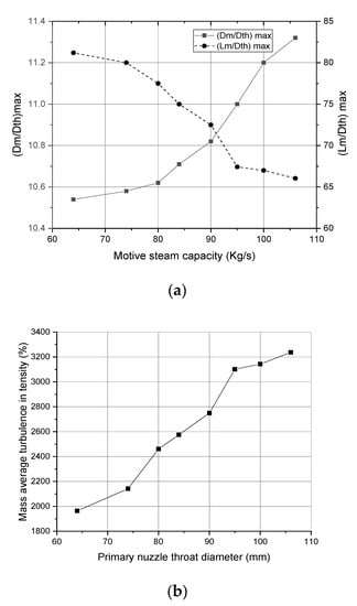 Based on the simulation data (Table 4) the following conclusions were drawn. For a fixed CRmax value and under fixed boundary conditions (temperature and pressure of both motive and secondary streams), regardless of ER value, the maximum possible ratio of the TVC’s nozzle diameter to primary nozzle throat diameter was the constant number 8.2 for all capacities to maintain a proper operation. What it means is that if 8.2 ≤ , the momentum created by motive steam cannot push the oblique shock wave from the constant diameter to the diverging zone. In this situation, the shock wave moves from the diverging zone into the TVC’s throat, thereby preventing double-choke (Figure 2c). For any capacity, the allowed values for () and () for the application of Equation (12) are unique. Figure 5a shows the variation of and vs. capacity of TVC. With the increase in motive steam capacity, more cross-section area is demanded, resulting in an increase in . As can be seen in Figure 5a, by increasing the capacity of a TVC, the dimensionless length of decreases. Kouhikamali and Sharifi [11] reported that a low mixing angle leads to increased mixing efficiency and consequently the ER, which is in agreement with our findings.