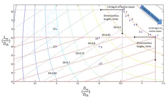 Figure 6 schematically shows the changes in ER as well as the motive steam capacity (blue spots—collected from Table 4) vs. the changes in and . At ERmax (ER = 0.95), the arrows determine the ranges in which Equation (12) can be used. The limitation varies with the change in capacity.