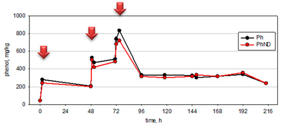 Residual concentration of phenol in Ph and PhND variants in the course of model bioremediation of contaminated sediments. Arrows indicate the addition of phenol in the model system—at the 2nd, 49th and 72nd hours.