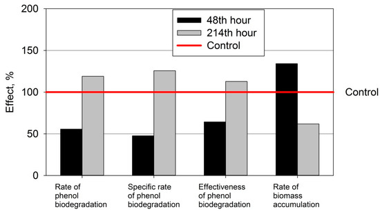 Figure 3 presents the effect of nanodiamonds on the kinetic parameters of the biodegradation of phenol, compared to the control variant Ph. It was found that, at the 48th hour, the rate of the biodegradation of the phenol in the variant with the added ND was 44.37% lower than that of the control variant Ph, while at the 214th hour there was an increase of 19.00% in the variant PhND. From the data that are presented in Figure 3, it was found that, at the 48th hour, the specific rate of the biodegradation of phenol in the variant PhND was 52.38% lower than that of the variant Ph, while at the 214th hour we registered an increase in the specific rate by 25.71% in the variant PhND. Similar to the RBP, the data showed a higher SRBP for the 214th hour in the variant with ND. Regarding the EFF, it was found to be 35.72% lower at the 48th hour than in the control variant Ph, while at the 214th hour it was found to increase the EFF by 12.75%.