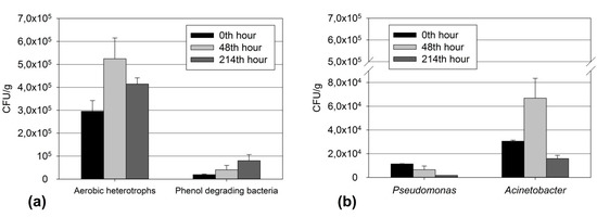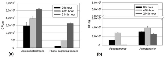 In the variant Ph, the quantity of Pseudomonas and Acinetobacter bacteria increased at the 48th hour (Figure 4b). This leads us to infer the exclusive role of both types of bacteria, the quantities of which determine their metabolic capacity to eliminate pollutants of different natures in the microbial community. These results coincide with the research of a number of authors, according to whom the adaptation of microbial communities to the biodegradation of toxic pollutants in concentrations that are close to critical involves the number of microorganisms of the genus Pseudomonas and Acinetobacter increasing; these are the main component of the culturable xenobiotic-degrading complex [72,74,75]. In our case, the bacteria of the genus Acinetobacter had a numerical advantage, during the whole process, over the bacteria of the genus Pseudomonas. In both groups there was a decrease in the number of cultured bacteria after the high intoxication shock at the 214th hour.