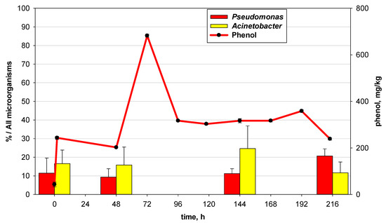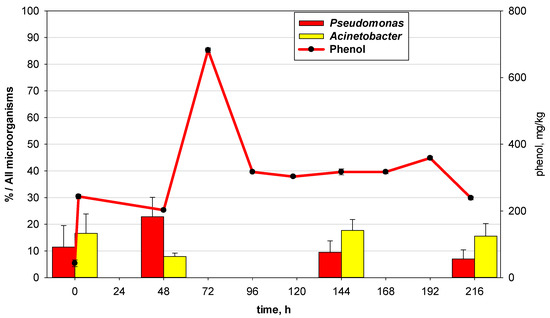 The bacteria of the genus Acinetobacter and especially those within the group of phenol-degrading bacteria remained present in relatively large quantities at the 214th hour. In contrast, the pseudomonads lost their leading role in biodetoxification. This is probably due to competition for substrates and electronic acceptors. Despite the smaller number of these bacteria, it is possible that they showed higher biodegradation activity. The quantity of cultured pseudomonads may be reduced by increasing the amount and activity of non-culturable Pseudomonas. The literature shows that both mechanisms are in force and that these two mechanisms are usually combined [30,72]. The community intensifies its biodegradation activity at the expense of the simultaneous manifestation of the following biological mechanisms: