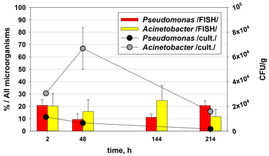 The genera Pseudomonas and Acinetobacter were studied by fluorescence in situ hybridization analysis. Bacteria of the genus Pseudomonas and the genus Acinetobacter have been selected as key microorganisms due to their importance in the biodegradation of xenobiotics. It is known that microorganisms from these two genera can use alternative pathways for energy supply and this property gives them more opportunities to develop resistance and reach their detoxification potential [72].