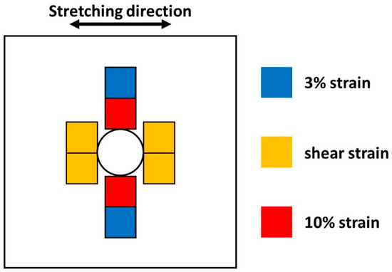 To evaluate the morphological changes that occur during the stretching process, some studies have used finite element analysis (FEA) [38,39,40,41,42,43,44,45,46] and image recognition [47,48,49,50] to determine the mechanical strain characteristics of materials. FEA and other methods of characterizing strain fields are used to determine the biomechanical relationship between cells and mechanical strain. The numerical supports may lead the traditional stretching test to have a strain gradient field through designing structural stress distributions. Thus, a single experiment can obtain several strained results.
