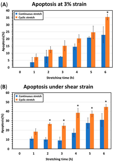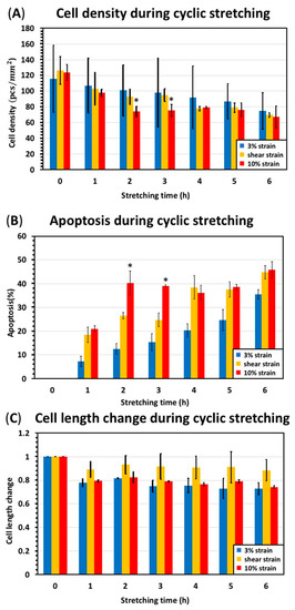 Apoptosis after the two types of stretching. (A) Apoptosis after continuous and cyclic stretching at a tensile strain of 3%. (B) Apoptosis after continuous and cyclic stretching under shear strain. (C) Apoptosis after continuous and cyclic stretching at a tensile strain of 10%. Black bars represent standard deviations; * p < 0.05.