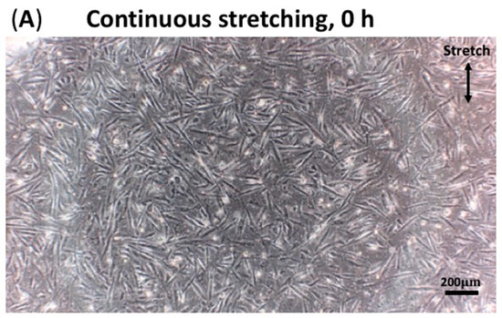 These experiments used a square type collagen-coated elastic polydimethylsiloxane (PDMS) membrane (PM22-Collagen I, Taihoya, Taiwan) with an area of 4 cm2 and a hole with a diameter of 3 mm in the center. This commercial membrane is well coated by the collagen and cells could be attached firmly on the PDMS membrane. The 3 mm hole was punched in the center of the membrane to produce a shear strain effect on the membrane after stretching and to increase the strain distribution without damaging the membrane during the stretching process. The PDMS membrane was rinsed with sterile Dulbecco’s Phosphate-Buffered Saline (Thermo Fisher, Waltham, MA, USA) and sterilized through exposure to ultraviolet light for 15 min in a biological safety cabinet. A trypsin-treated HK suspension was seeded on the elastic membrane at a density of 1.25 × 104 cells/cm2 and then placed in 5% CO2 at 37 °C in a carbon dioxide incubator for 24 h. The membrane seeded with HKs was placed in a stretching device designed by the authors’ laboratory for uniaxial stretching at a strain of 3% (0.06 mm) for 6 h. Two stretching methods were investigated: continuous stretching with a constant load and cyclic stretching with a frequency of 1 Hz.