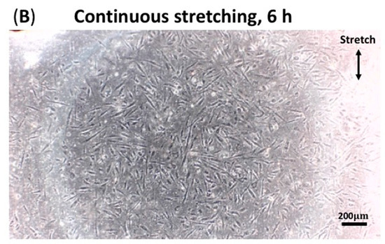 - Greiner, A.M.; Chen, H.; Spatz, J.P.; Kemkemer, R. Cyclic tensile strain controls cell shape and directs actin stress fiber formation and focal adhesion alignment in spreading cells. PLoS ONE 2013, 8, e77328. [Google Scholar] [CrossRef] [Green Version]