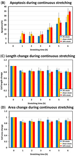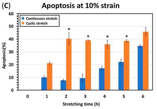 In this study, high strain and shear induced apoptosis in cells. The strain set on the stretching machine was 3%, and due to the specially shaped film, there were 0–10% strain and shear strain on the film, as shown in Figure 1. We chose 3% (blue, Figure 2) and 10% (red, Figure 2) strain levels to compare the effects of strain on apoptosis. Our previous studies [30,31] reported that HK cells under cyclic stretching reorient in the vertical direction relative to strain. The topics of cell redirection and migration are for separate studies. This study focuses on apoptosis, since cell death could be seen after eye rubbing. After 1 Hz cyclic stretching for 6 h, 23% of cells under 3% strain were apoptotic, which is a lower apoptosis rate than the cells under 10% strain with an apoptosis rate of 36%. After continuous stretching for 6 h, the rate of apoptosis of cells under 3% strain was 35%, which is lower than that of cells under 10% strain, which was 46%. Regardless of the stretching method, the apoptosis rates of cells under 3% strain were lower than those of cells under 10% strain. Furthermore, the magnitude of tensile strain was positively correlated with apoptosis. Additionally, shear strain (orange, Figure 2) induced apoptosis in HK cells. The data presented in Figure 4B and Figure 6B demonstrate an increase in apoptosis after 6 h of shear stress. Therefore, stretching is not conducive to cell proliferation but instead leads to apoptosis.