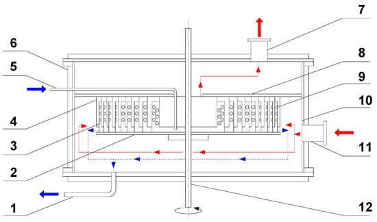 Structure of the rotating zigzag bed (RZB): (1) liquid outlet; (2) rotating disk; (3) rotating baffles; (4) static baffles; (5) liquid inlet; (6) insulation materials; (7) gas outlet; (8) static disk; (9) perforations; (10) shell; (11) gas inlet; (12) shaft. (Blue and red lines indicate liquid and gas streams, respectively).